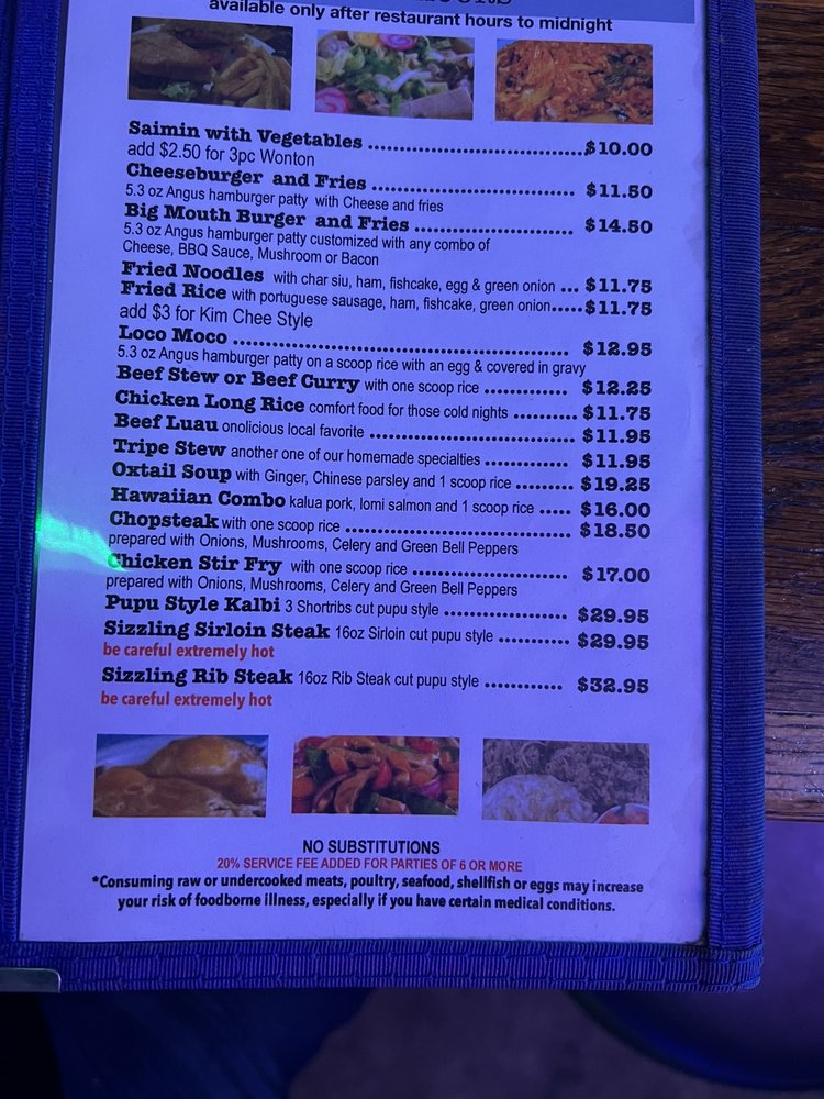 Nancy's Kitchen, a local gem in Waipahu, offers a delightful menu of American bar classics with a Hawaiian twist. From flavorful Adobo Fried Rice to hearty local style dishes, such as Chef Salad and Tuna Salad, there is something for everyone. Don't miss out on their signature Nancy's Hawaiian Plate, featuring Lau lau, lomi salmon, and kalua pig - a true taste of the islands. The restaurant boasts a range of amenities, from a full bar and outdoor seating to dog-friendly accommodations and compostable packaging. Whether you're looking for a cozy dinner spot or a lively happy hour hangout, Nancy's Kitchen is the perfect destination. Don't forget to try their delicious dishes and experience the welcoming ambiance firsthand.